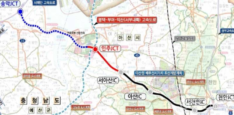 당진천안간 고속도로 신설됩니다. 현재 아산천안구간은 평균 71%의 공정률을 보이고 있으며, 아산구간 (인주~염치) 2개공구는 21년 6월 22일에 공사낙찰되었습니다. (1공구: 현대산업개발, 2공구: 한신공영). 이제 단진~아산(인주)구간이 남아있습니다. 요즘 한국도로공사에서 기본/실시 설계관련해서 지질조사, 측량조사 등 여러 용역을 발주했거나 하고 있습니다. 아래 조선은 현재까지 나온 노선도로 예전 노선과는 좀 달라졌죠. 현재는 삽교천방조제를 따라가는 변경노선이 유력해 보입니다. 당진에는 신평에 신평IC가 신설예정, 송악읍 전대리 서해안 고속도로에 접속.